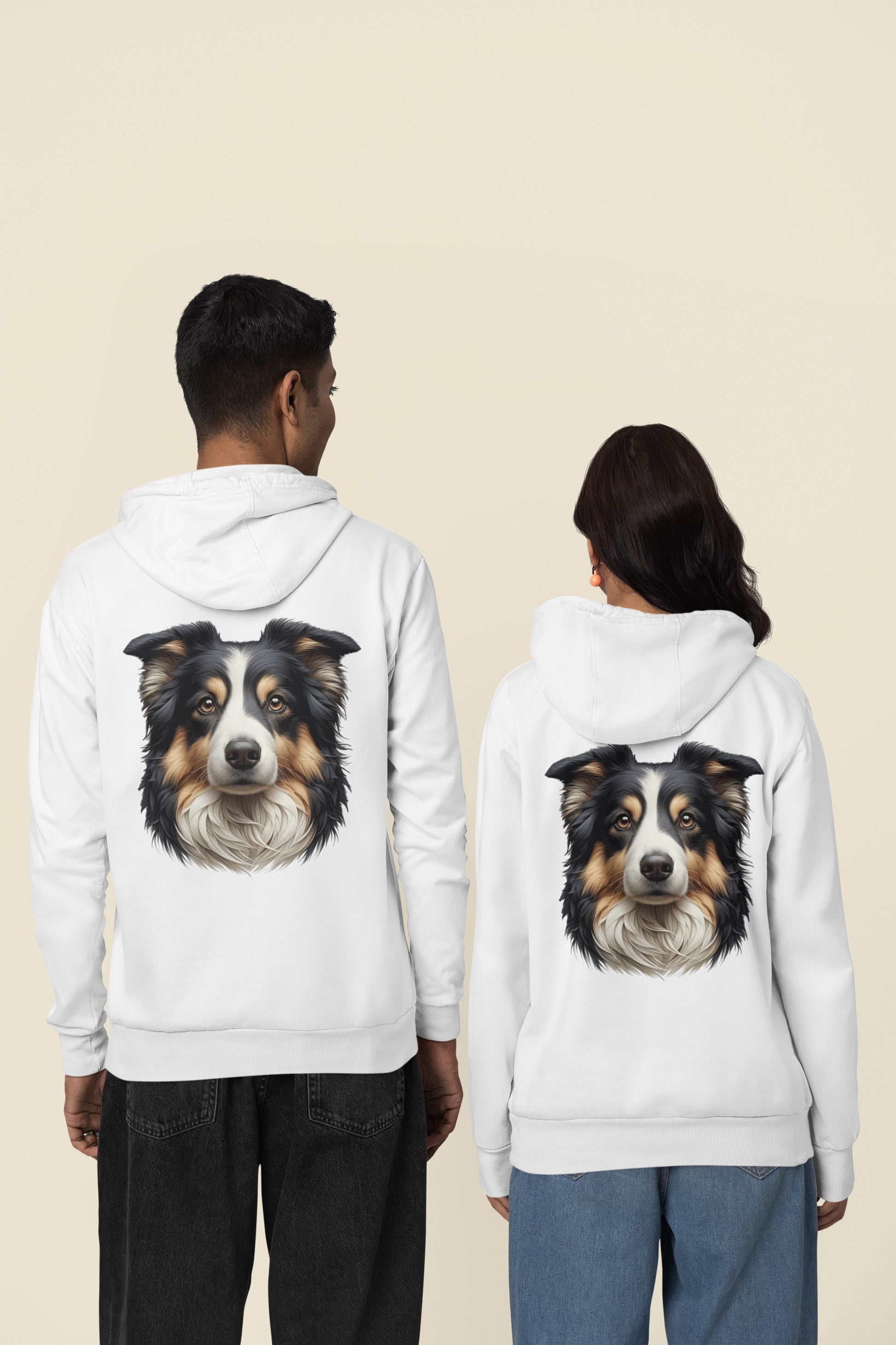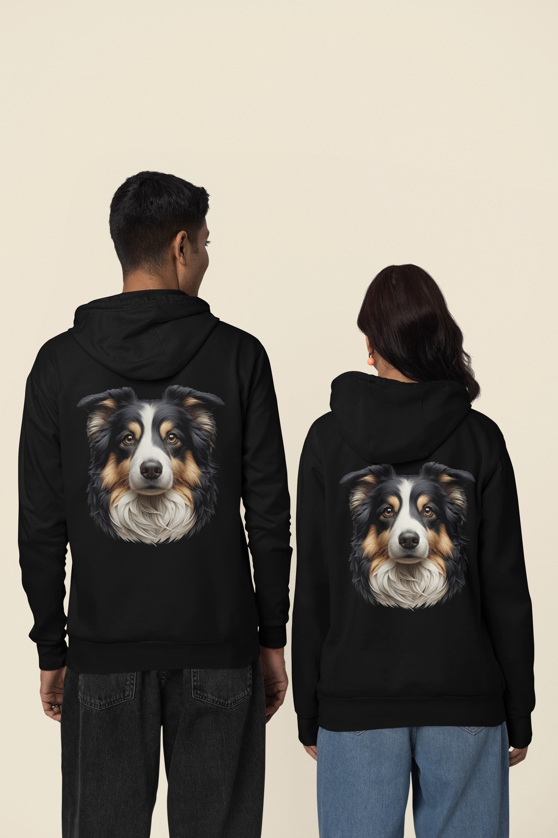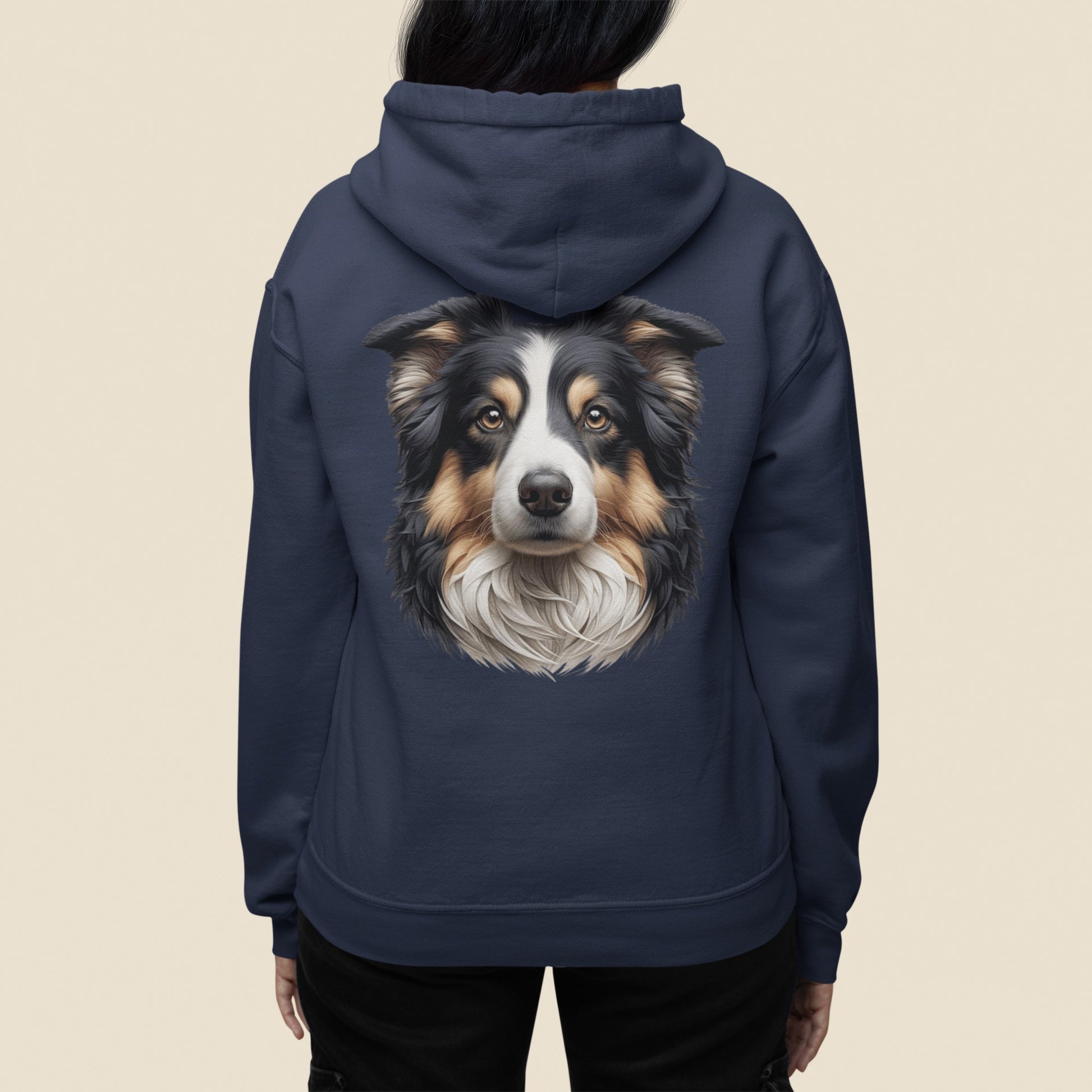Wrap up in the warmth of our Australian Shepherd Black Tri Realistic Back Print Hoodie. Featuring a lifelike depiction of the black tri Australian Shepherd on the back, this hoodie is a tribute to one of the most beloved coat patterns. It's designed for those chilly days or cozy nights in, providing both comfort and a piece of your favorite breed to carry with you.