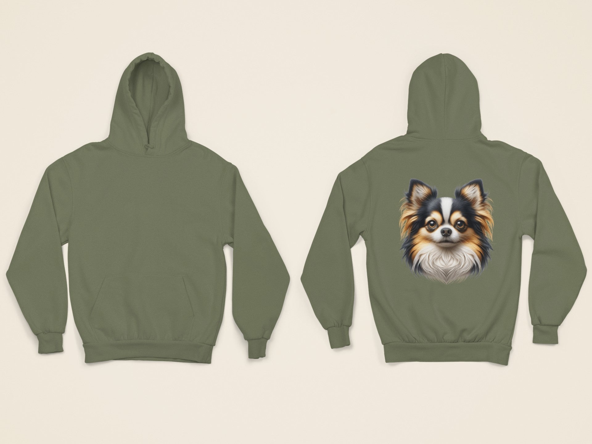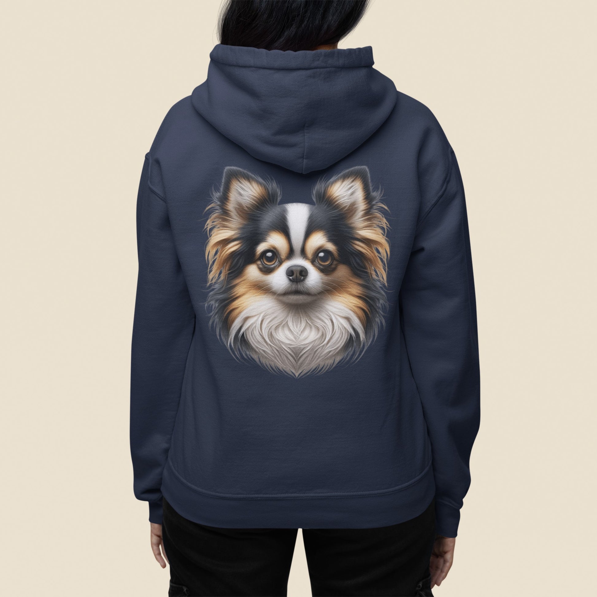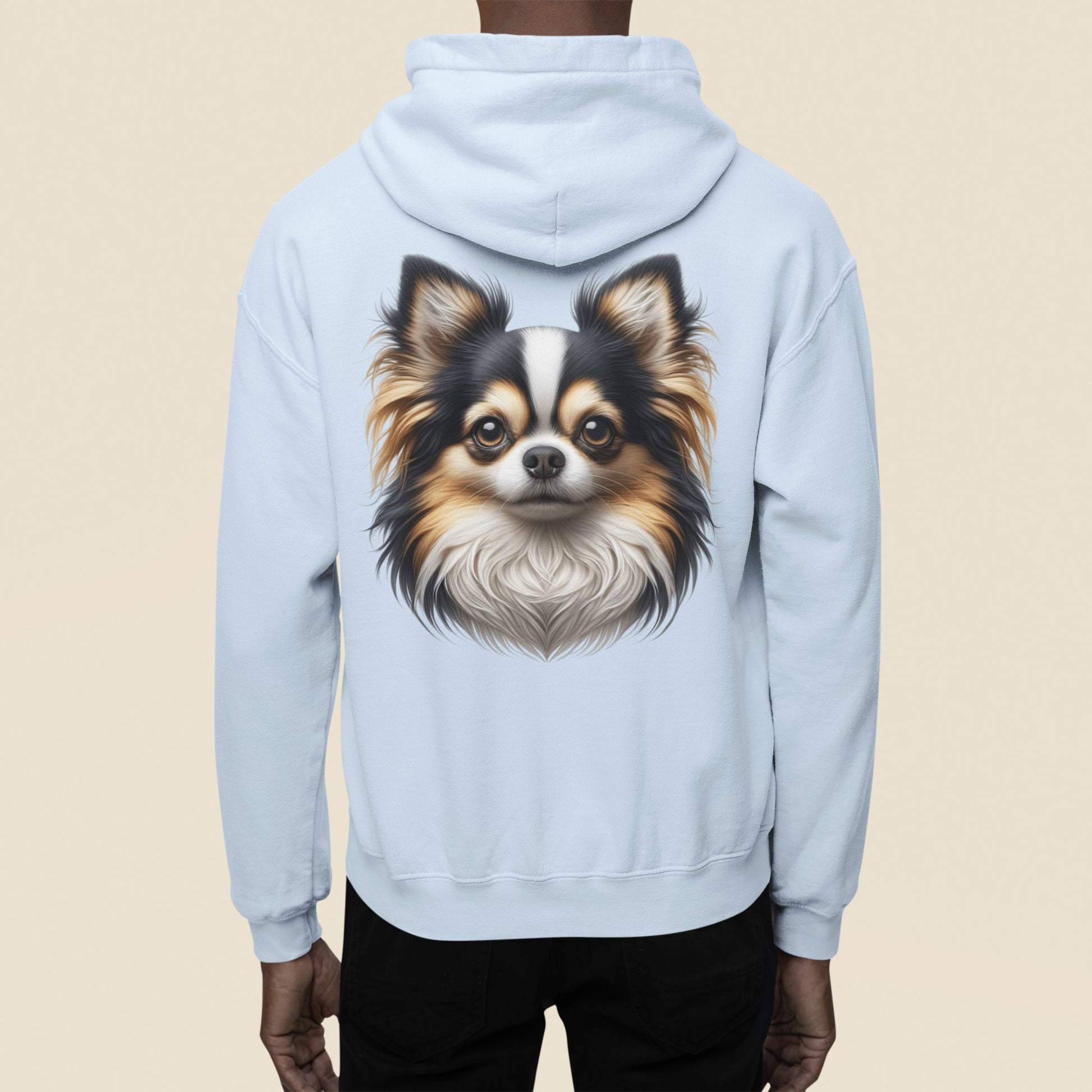Embrace the distinction of the Chihuahua with our Chihuahua Tricolor Long Coat Realistic Back Print Hoodie. Featuring a lifelike depiction of the tricolor long coat Chihuahua on the back, this hoodie offers both a celebration of this exquisite breed and the cozy comfort you crave. Perfect for those cool days or laid-back evenings, it brings your favorite breed into your everyday style.