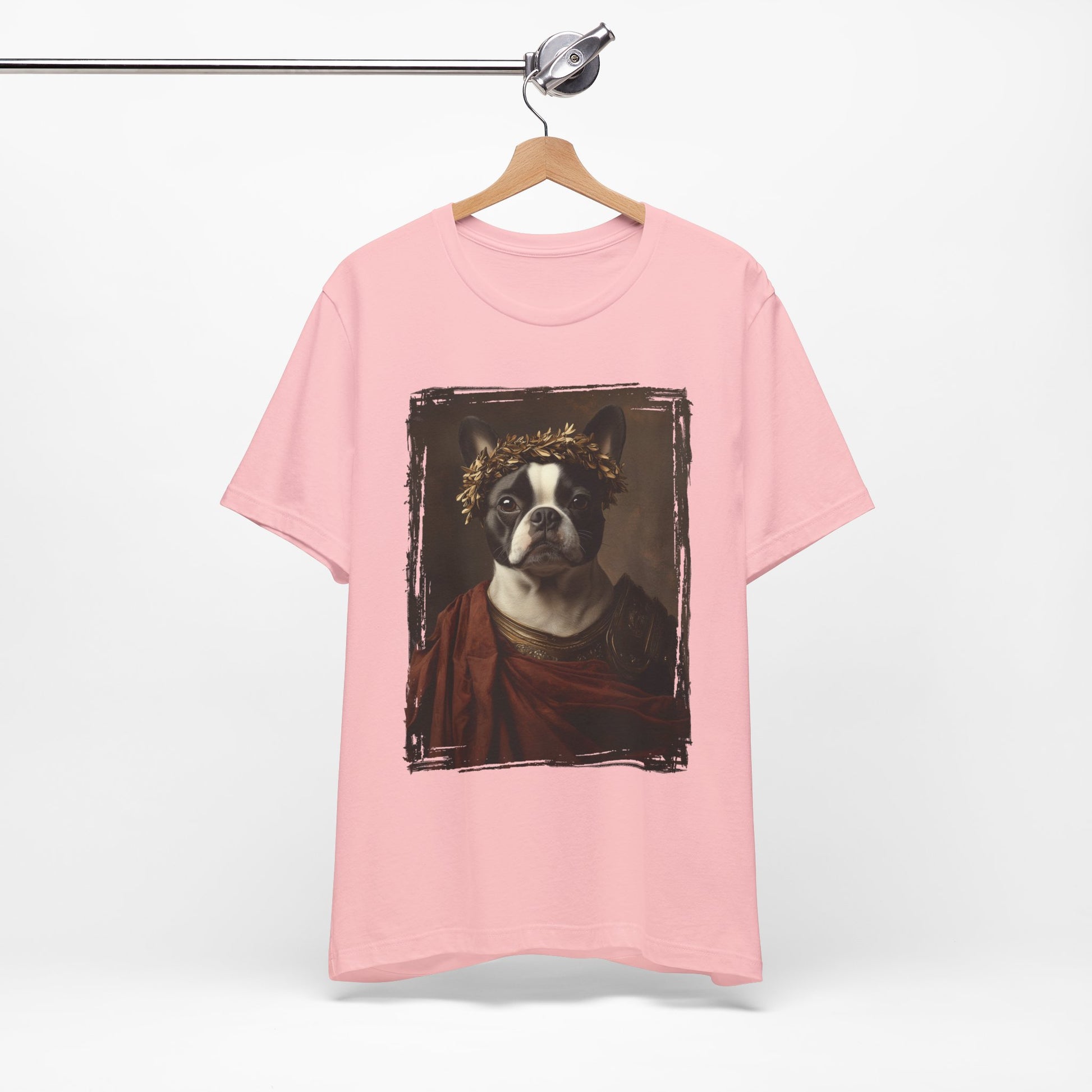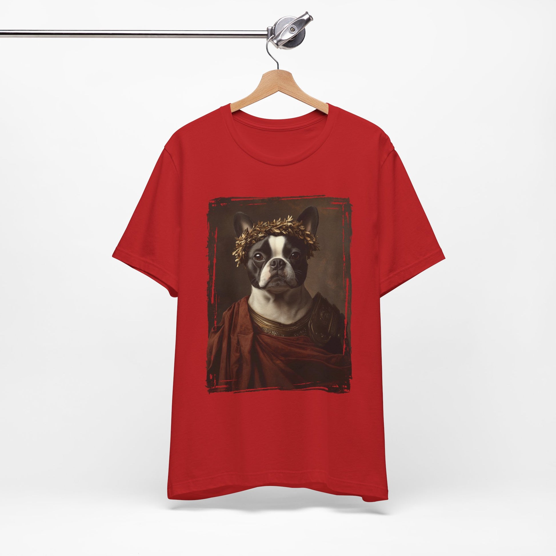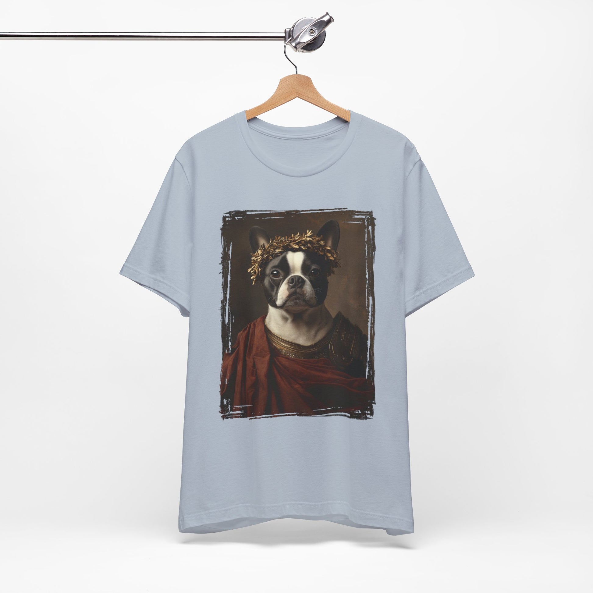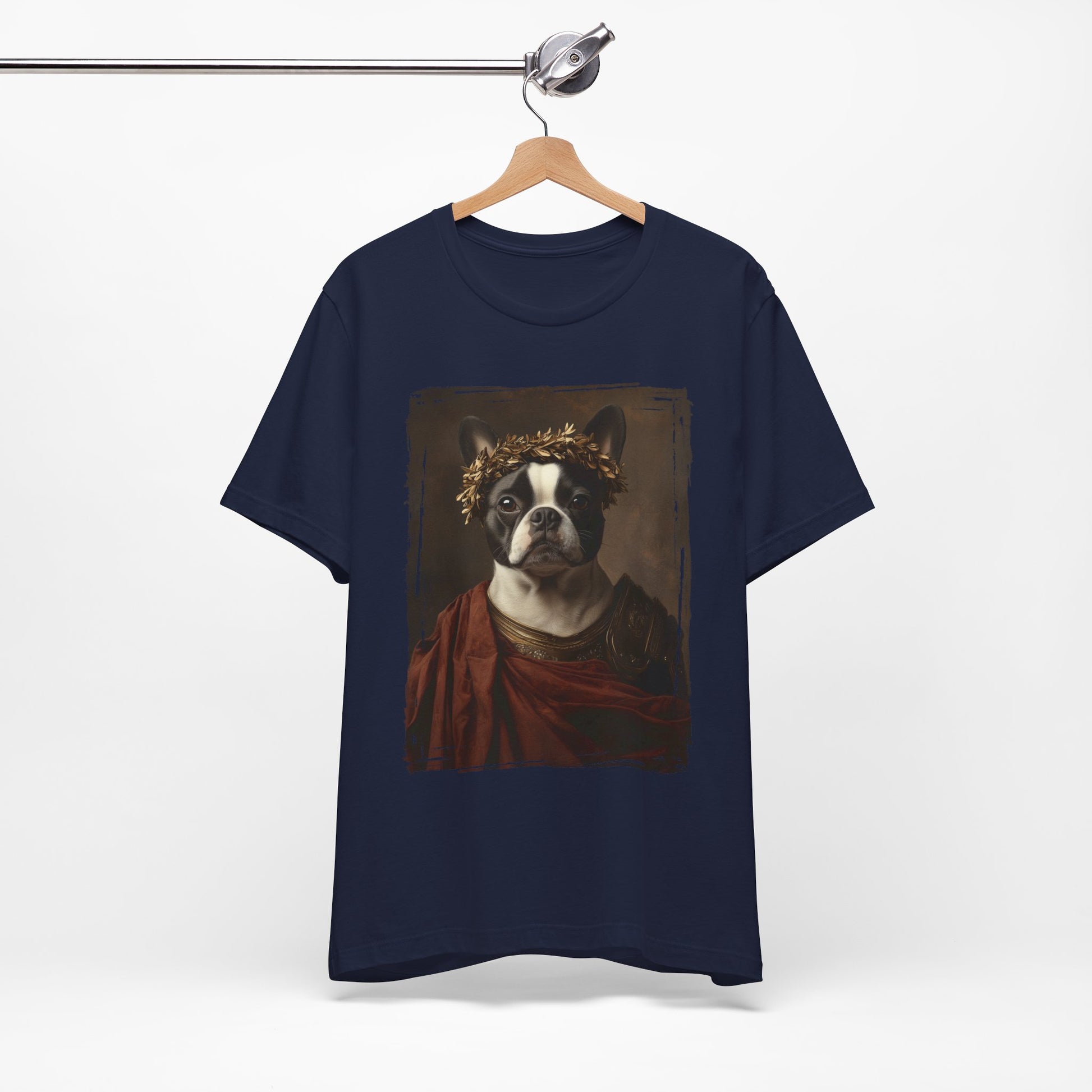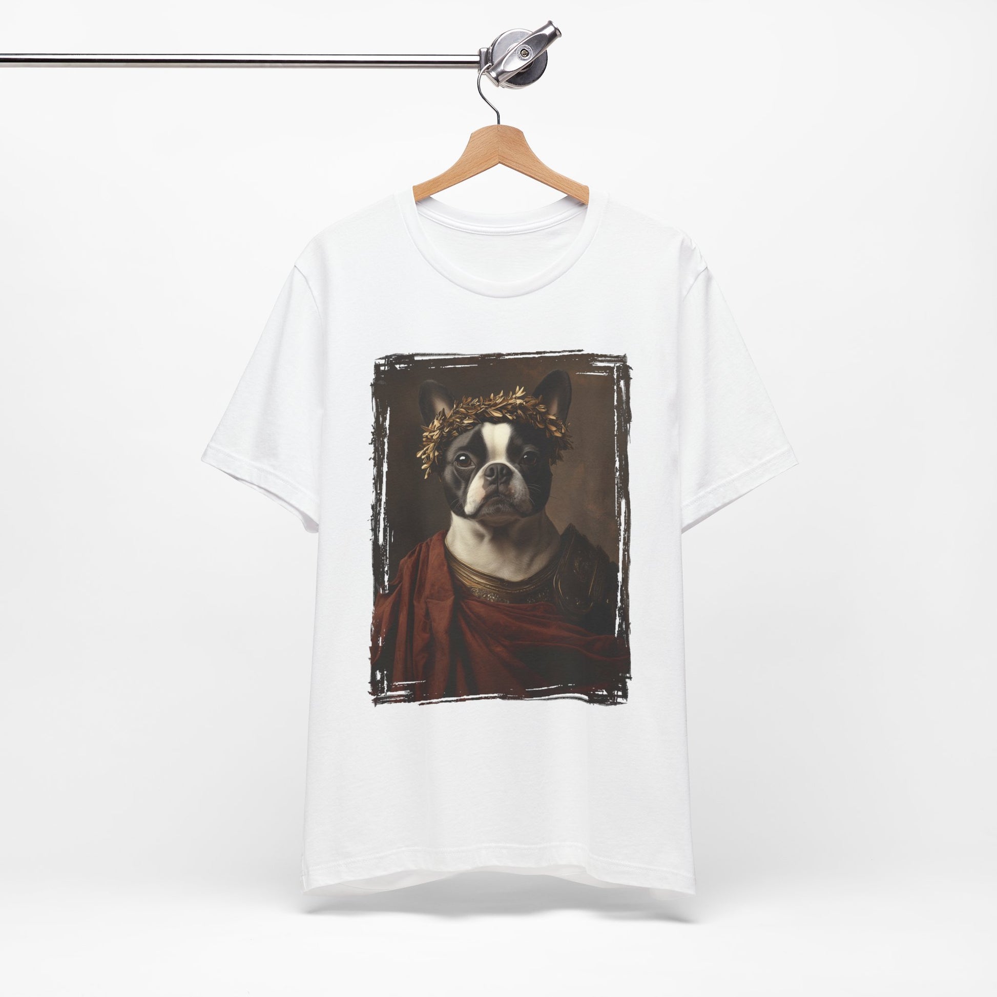 For Boston Terrier lovers, this T-shirt is a warm tribute to your spunky companion. Our exclusive design transforms your delightful Boston Terrier into a regal Roman Emperor, blending classic elegance with a modern twist.